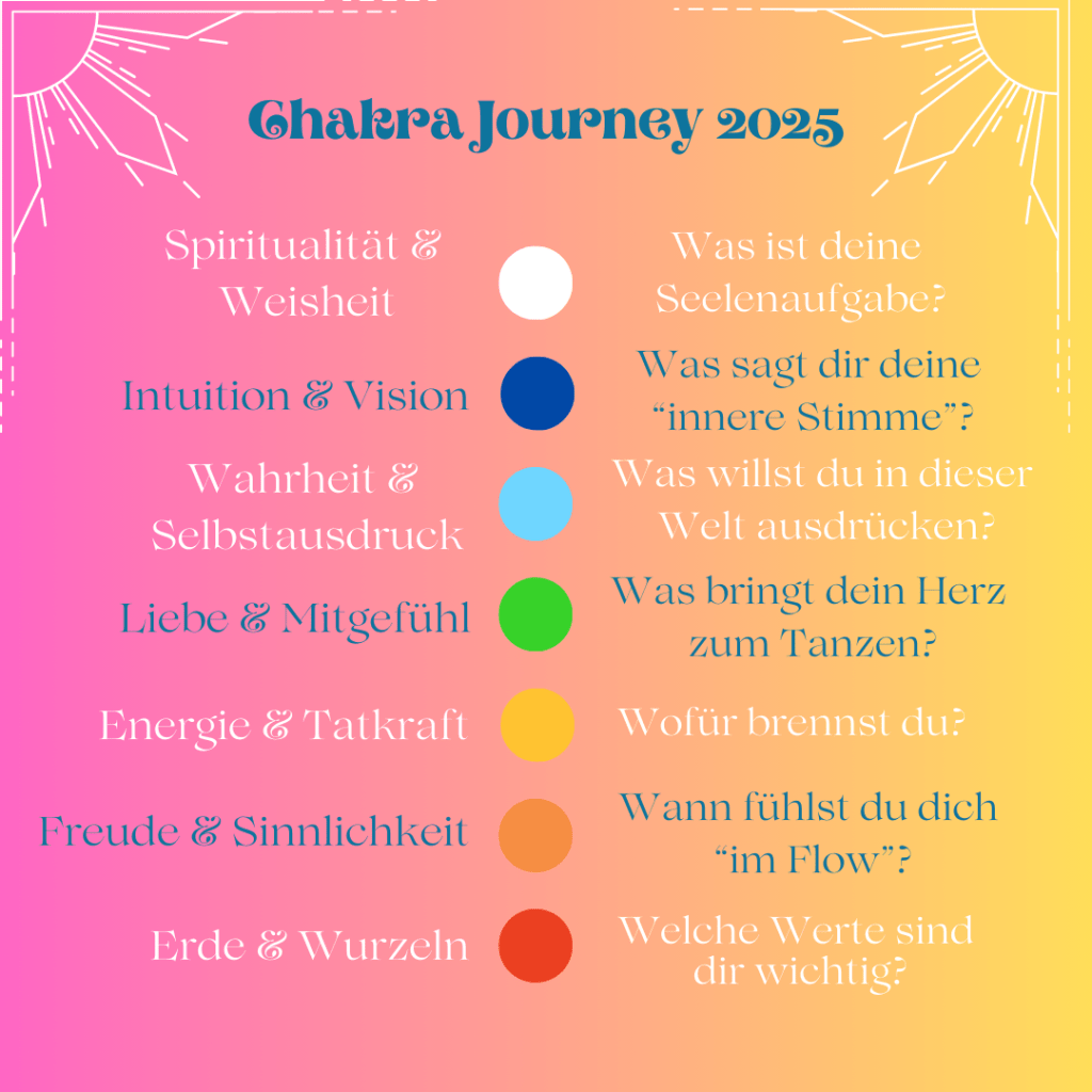 Weil die Chakra Journey Anfang Jänner SO gut bei Euch angekommen ist, wird es einen 2. Teil geben. Du kannst dir die Termine jetzt schon im Kalender vormerken bzw. dich am besten gleich anmelden – so erhöhst du die Chance, dran und deiner Vision treu zu bleiben.