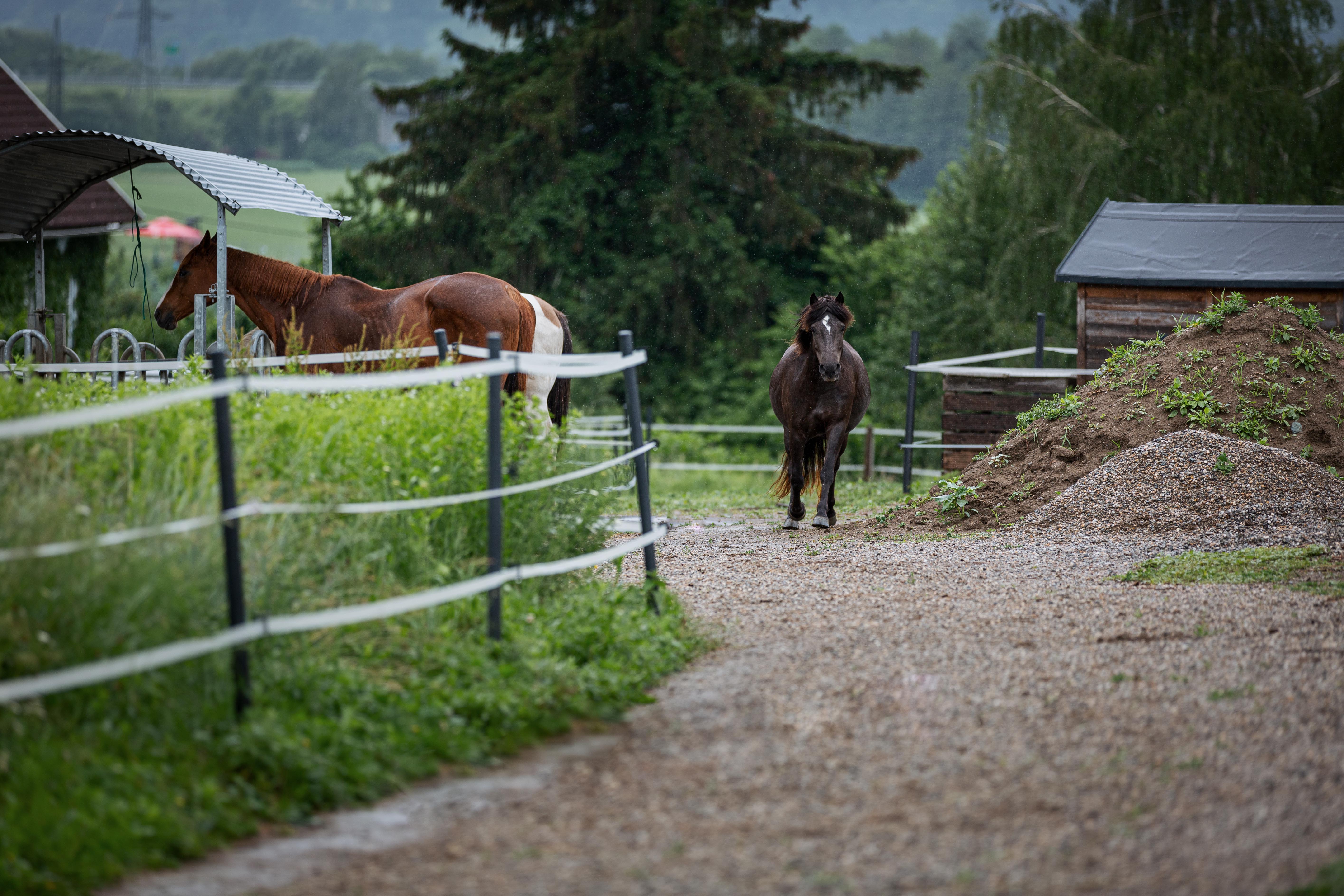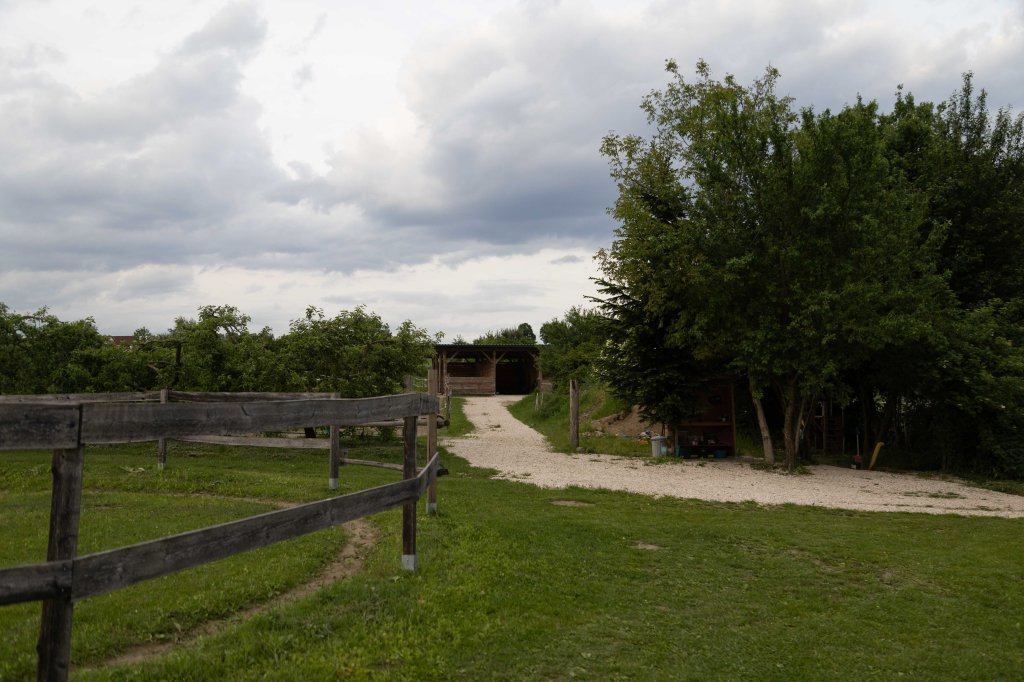 ein ca. 400m langer Trail mit 24/7 Heu zur Verfügung und stundenweise Weide in den Sommermonaten. Die Wege sind zu ca. 50% befestigt (Rundkies) und 50% naturbelassen (sandige Erde). Es gibt Bäume und Sträucher am Weg, eine Salzleckstein-Station, einen natürlichen Wasserdurchlauf, einen Unterstand mit Heunetzen bei Bedarf und eine befestigte Raufe.