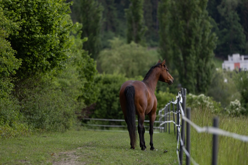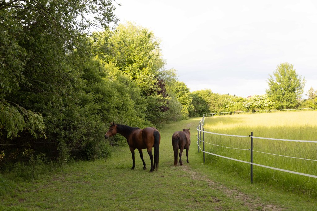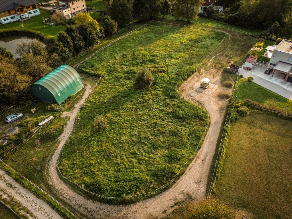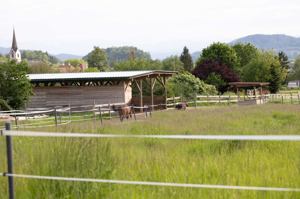 ein ca. 500m langer Trail, umgeben von einer Vielfalt aus Hecken, Sträuchern und Bäumen (z.B.: Hasel, Weide, Weißdorn, Hartriegel, Pappel, Brombeere,…), zeitgesteuerte Heufütterung mit Fresspausen von max. 3h, stundenweise Weidezeit in den Sommermonaten auf fruktanarmer Kräuterwiese, befestigte Wegstrecken und Naturboden, frostfreie Tränke, geräumiger Unterstand mit Heunetzen bei Bedarf, Salzleckstein-Ecke. Hier entstehen in Zukunft ein großzügiger Sand-Wälz-Liege-Platz und Wegabschnitte mit unterschiedlichen Bewegungs-Anreizen zur Förderung der (Huf-) Gesundheit.
