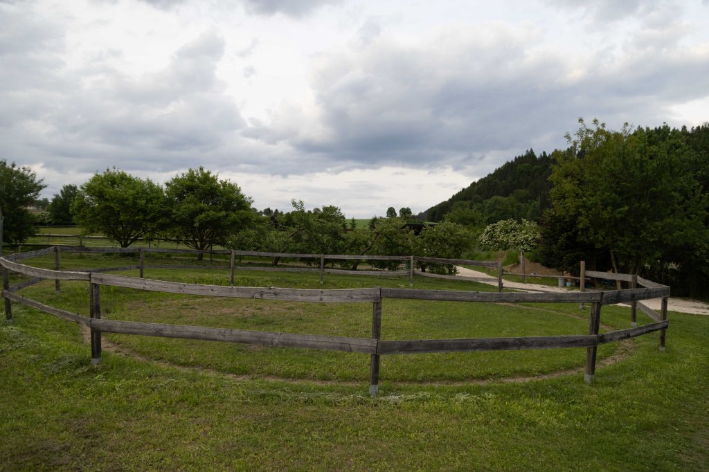 Ein Roundpen und ein Reitplatz, jeweils mit sandigem Wiesen-Naturboden sind ebenfalls vorhanden.